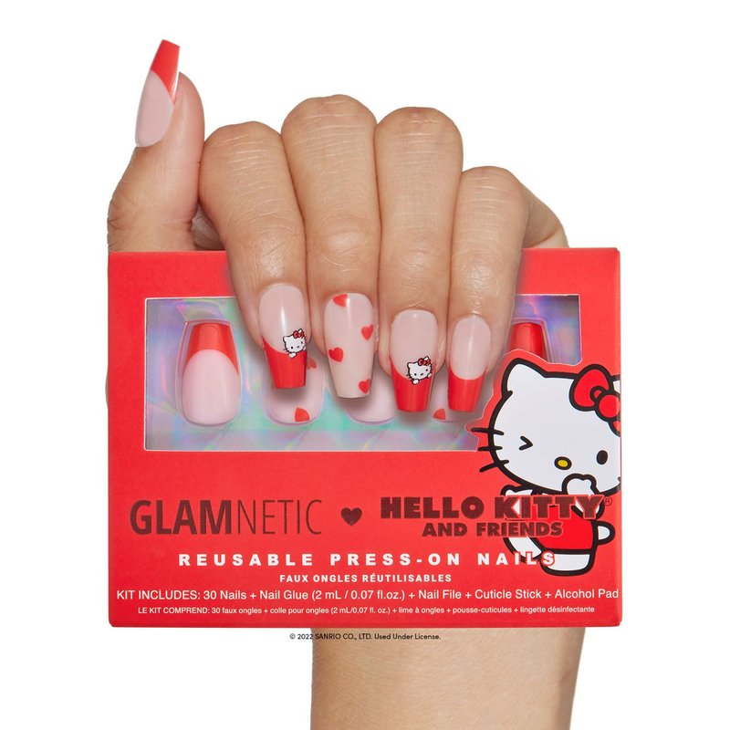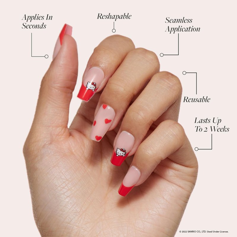 - Red French Tip Hello Kitty Graphic Nails - offered in a short coffin shape, this charming nail set features cherry-red french tips, with accent nails adorned in the cutest heart designs, and a peekaboo Hello Kitty graphic for some extra adorableness.