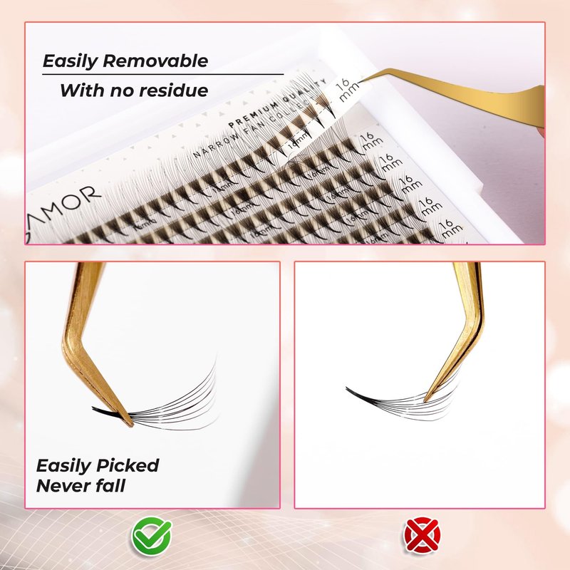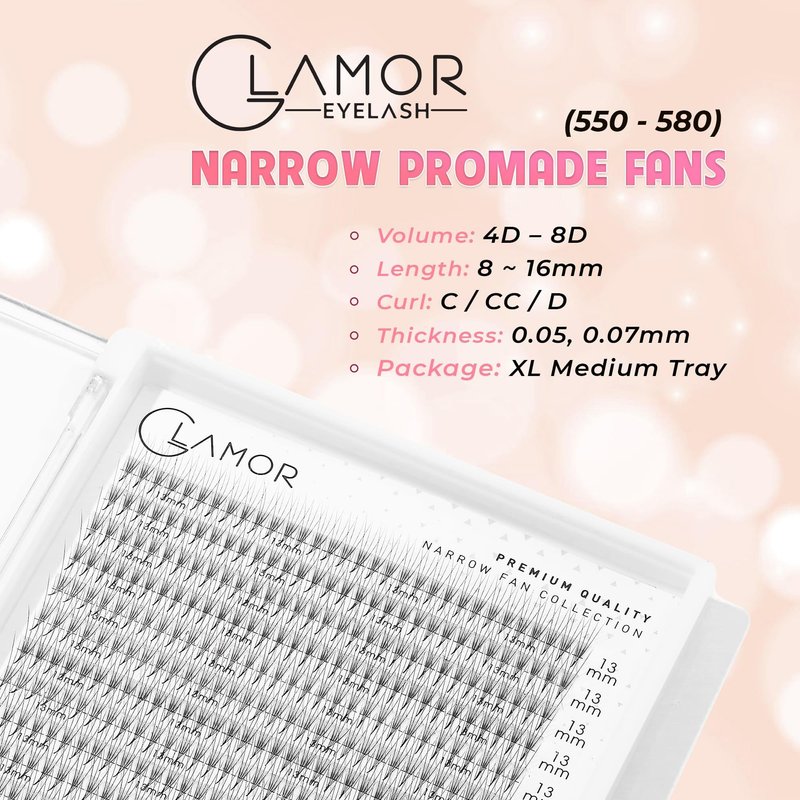 - 💗 440 - 460 NARROW PROMADE FANS TRAY: GLAMOREYELASH provides you with a huge number of soft, comfortable, and cost-effective Promade Lashes for your creative artwork. Our gorgeous narrow lash fan is made entirely by the Glamor meticulous team, so you don't have to be concerned about our high-quality eyelash extension kit.