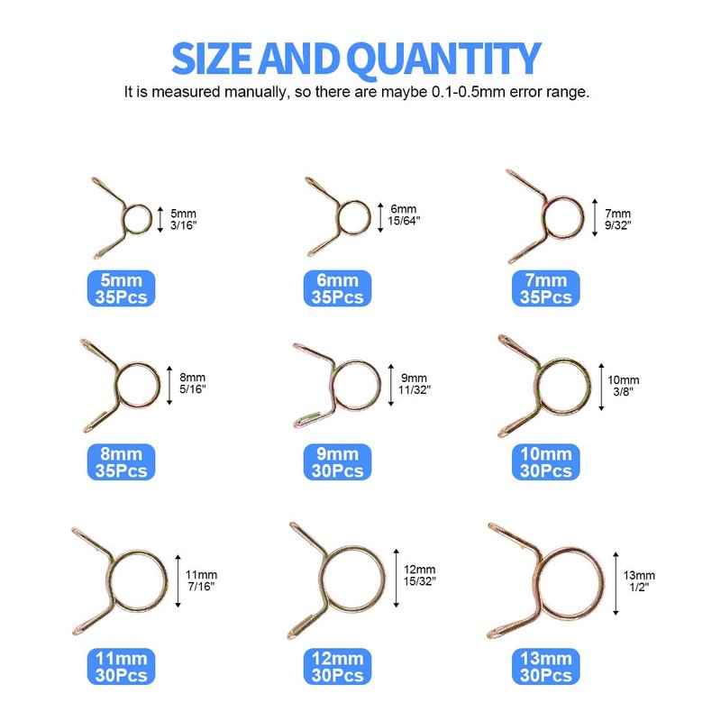 - ☆【Wide Hose Clamp Size:】 In this set, we provide 9 size of hose clamps which are 35pcs 5mm, 35pcs 6mm, 35pcs 7mm, 35pcs 8mm, 30pcs 9mm, 30pcs 10mm, 30pcs 11mm, 30pcs 12mm, 30pcs 13mm, total 290pcs packed in a plastic box, easy to storage and carry.