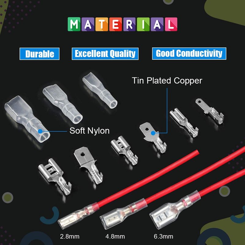 - Package Include: In this kit, it include 2.8mm/4.8mm/6.3mm male and female crimp terminal connector block 210pcs and 105pcs insulating sleeves total 315pcs packed in a plastic box