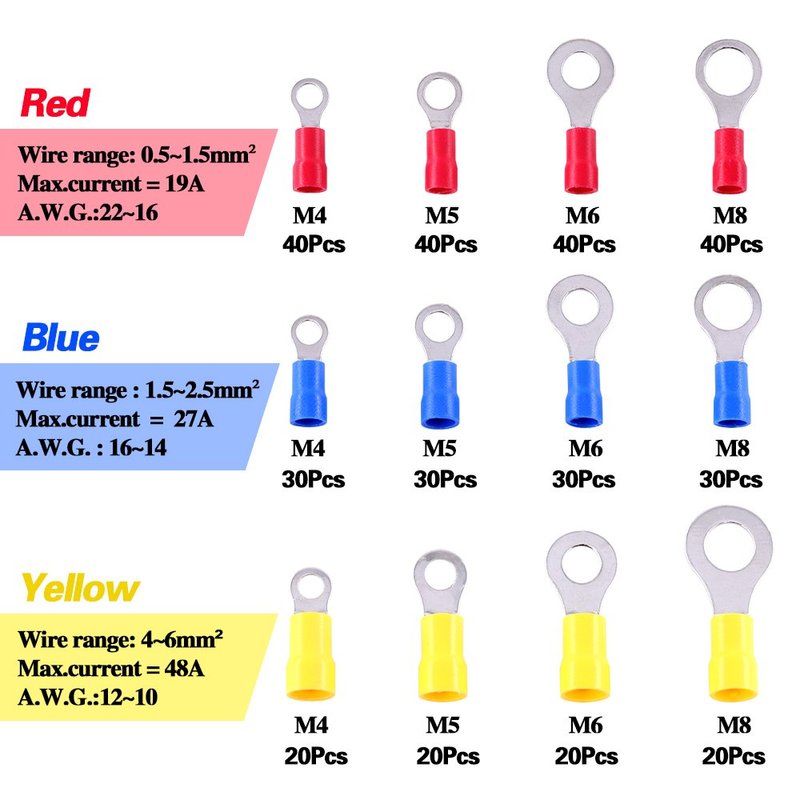 - Package includes: M4 M5 M6 M8 ring quick disconnect insulated crimp terminals connectors