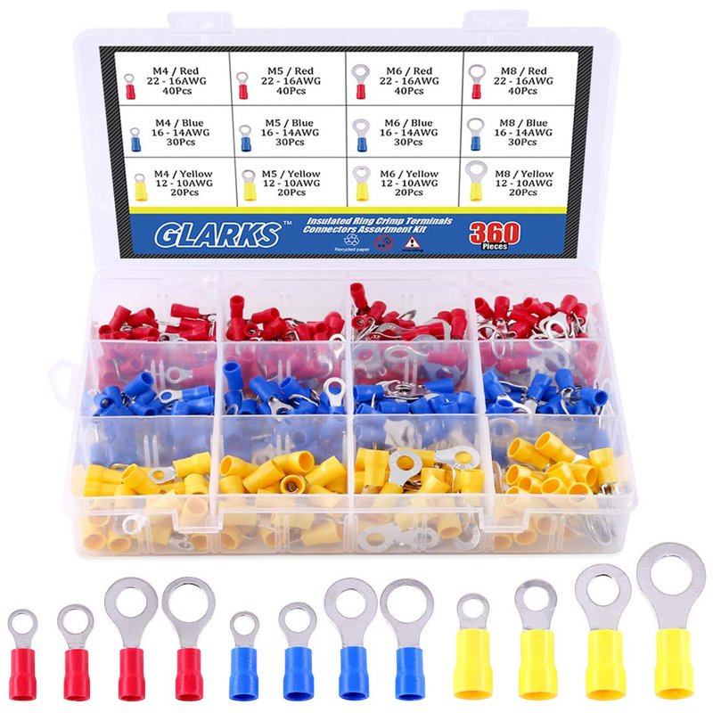 Glarks 360pcs 22-16/16-14/12-10 Gauge Mixed Quick Disconnect Electrical Insulated M4 / 5/6 / 8 Ring Crimp Terminals Connectors Assortment Kit