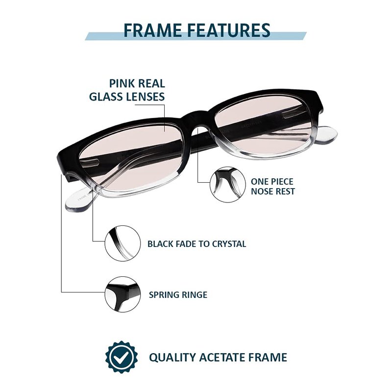 The G502 reading glasses are high quality pink real glass reading glasses. Made with Schott German Glass, these lenses bring true HD vision. The pink real glass lenses offer the highest quality optics on the market. They are blue light blockers and UV protectors. In addition, they are extremely durable and scratch resistant, bringing more comfortable to use. Also, the crystal clear vision reduces eyestrain and eye fatigue. The pink tint real glass lenses are perfect for indoor use. This rectangular frame is made with top acetate, which makes our high quality frame both lightweight and comfortable, bringing the classic look perfect for males and females. Plus, this black fade clear stylish frame has a single bridge and spring hinges, so you will be sure our frame will stay secure for long time use. Our G502 Pink Real Glass Reading Glasses have a wide range of magnifications to perfectly fit your needs without compromise your style.