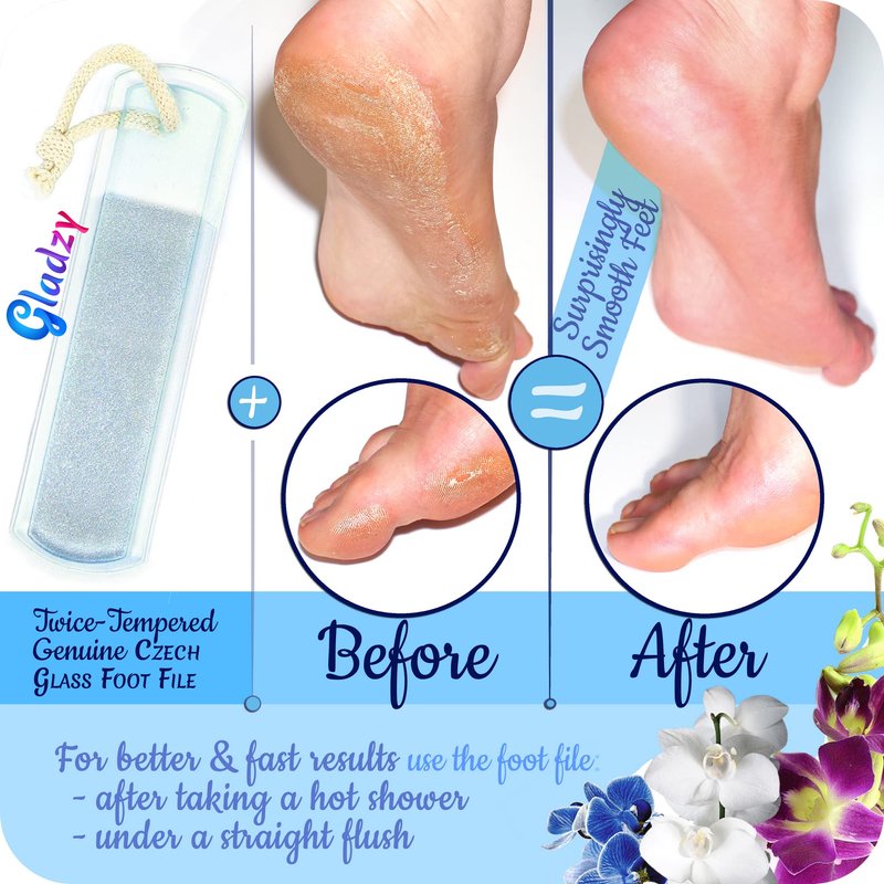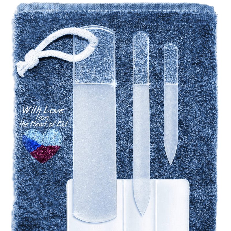 - Genuine Czech Glass Nail Files - Gladzy Beauty nail files for natural nails all types (sensitive, thin, etc.). Our crystal nail files, also known as a Bohemian glass nail files, are perfect for regular use to maintain strong, healthy nails. Professional grade multifunctional set contains 3 files for manicure and pedicure and a terry towel: double-sided mini nail file; 3mm thick medium nail file with two different grit surfaces; 6mm thick large foot rasp with two different grit surfaces and with a knotted string for handling. Plus, you get travel PVC sleeve and 100% soft ring spun cotton towel as a gift!
