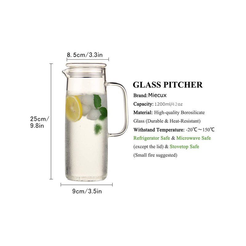 - 【 Glass Lid】Miecux Glass Pitcher has a glass lid that will allow you to pour your water without letting fruit into your glass.This fridge pitcher can be used as iced tea pitcher,tea carafe,hot glass pitcher and sun tea jar.