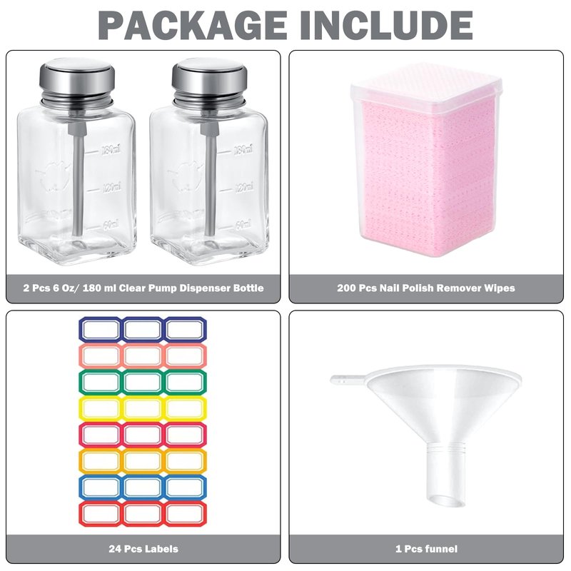 Glass Pump Bottle Dispenser Set, 6 Oz/180 ml Clear Pump Bottles with Metal Flip Cover, 200 PCS Lint Free Nail Wipes, Makeup Nail Polish Remover Refillable Container Push Down Dispenser Bottles