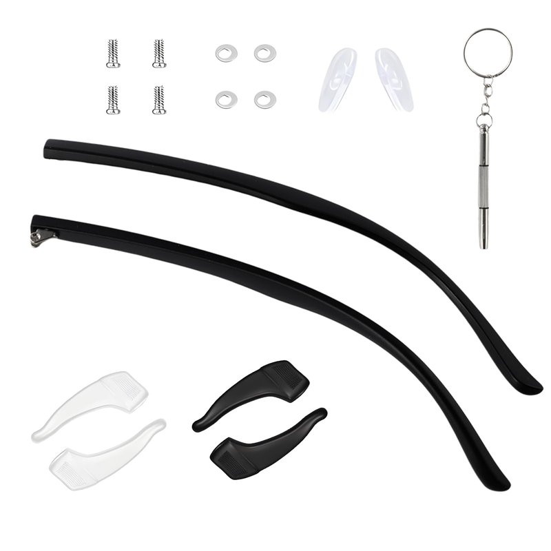 Package contents: 1 pair of glasses arm replacement parts (with screws, washers, screwdriver, nose pads, 2 pairs of glasses spinning slides)