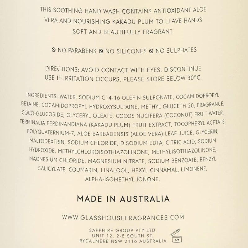 - CLEANSING, SOOTHING & MOISTURIZING: Our liquid hand soap is enriched with Aloe Vera for its antioxidant, soothing and moisturizing properties, Kakadu Plum Extract (rich in Vitamin C) to soothe the skin, Coconut Fruit Water to leave your hands feeling cleaner and hydrated, and Vitamin E Acetate for added antioxidants.