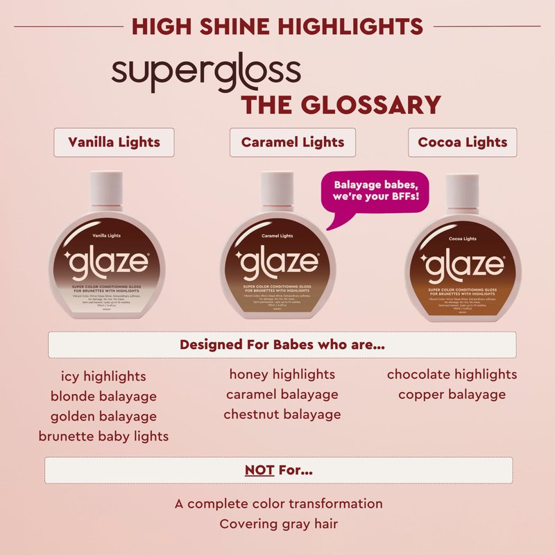 Super Gloss is like a tinted moisturizer for your hair that boosts hair color vibrancy, repairs the look of damage, and adds showstopping shine for salon-worthy results, minus the salon price tag. Super Gloss in Caramel Lights boosts brunettes while enriching warm caramel tones, perfect for balayage and highlighted hair. Using kindCOLOR technology which blends gentle dyes with hydrating fatty acids, Glaze hair gloss adds a boost of vibrant hair color that cares and repairs the look of damaged hair. Super Gloss is powered by GlaziPlex - a unique complex of intensive hair conditioners and glossifying hair treatments - for mirror glaze hair shine. Infused with naturally derived Babassu Oil, this ultra-lightweight formula repairs the look of dry damaged hair, leaving your hair irresistibly soft and glossy. Say goodbye to dull, lifeless hair and hello to lustrous locks that are sure to turn heads. Super Gloss hair treatment is sulphate-free, silicone-free, ammonia-free, paraben-free, 100% vegan, and cruelty-free. For best results, apply like a hair conditioner to clean, damp hair, wait 10 minutes, rinse and style as usual. Use Glaze hair gloss treatment as often as you like for a kick of color and shine that lasts up to 10 washes. Always match your shade to the lightest tones in your hair. Do not use darker shades on blonde, bleached or more porous hair as this risks staining.