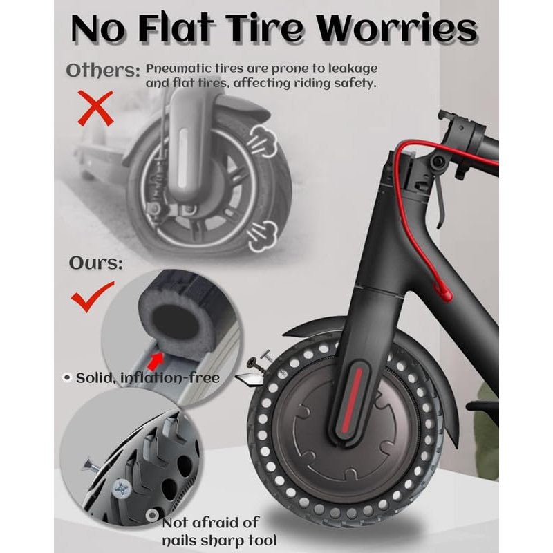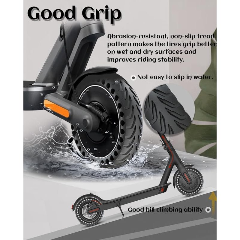 - 🛴【New Honeycomb Tire 8.5 Design】Full tire for electric scooter has a honeycomb design. The honeycomb hole can dissipate heat and absorb shock. Shock absorption and skid resistance, high-quality and durable. This 8.5 inch scooter tire has better elasticity to respond to road irregularities, such as meadows, uneven roads and flooded roads.Thickened tire design, no need to worry about puncture damage.