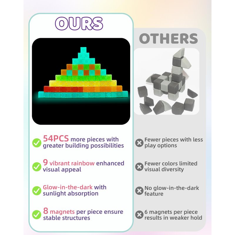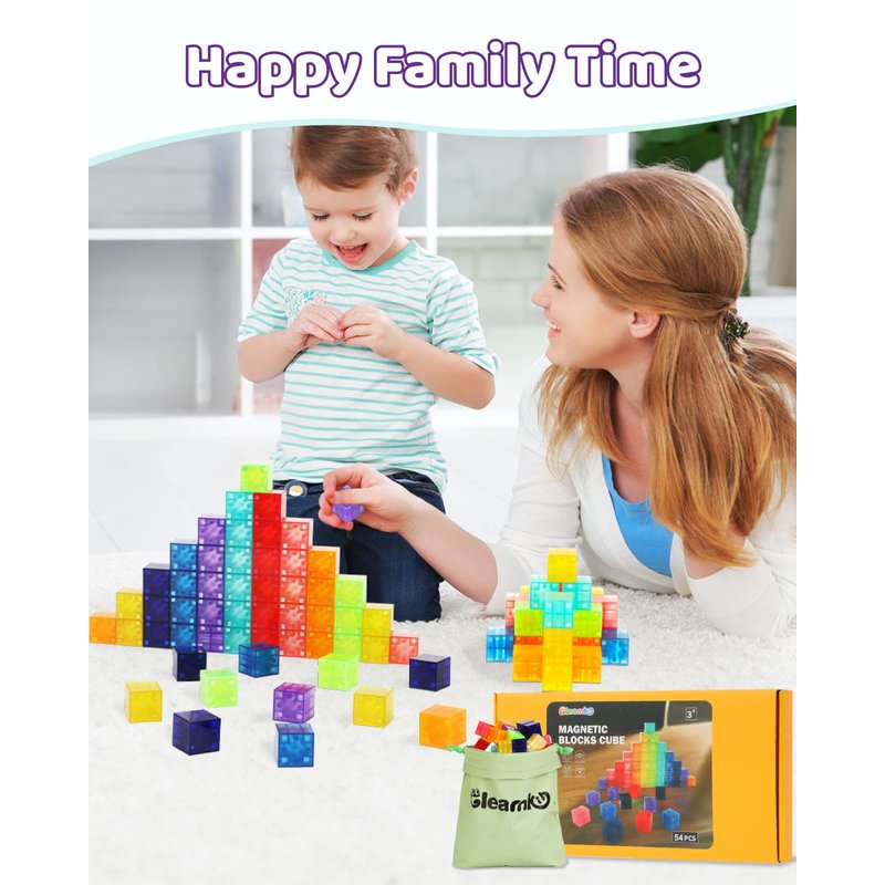 54PCS Rainbow Magnetic Blocks: Spark your child's imagination with Gleamkid's 54-piece rainbow magnetic block set. Featuring 9 vibrant colors, these magnetic cubes encourage creativity, color recognition, and sensory play. Ideal for boys and girls.