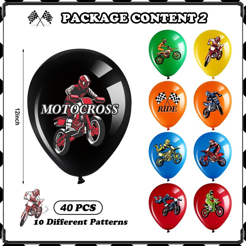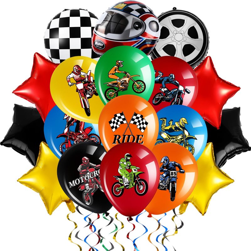 - Large Quantity: you will get 48 pieces of dirt bike themed balloons in motocross party balloons in 16 styles, including 40 pcs dirt bike balloons which measure about 12 inches, 1 helmet balloon, 2 tire balloons, 2 checkered balloons, 3 star balloons. Enough to meet your dirt bike sports racing party need
