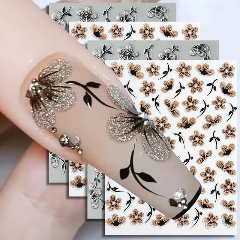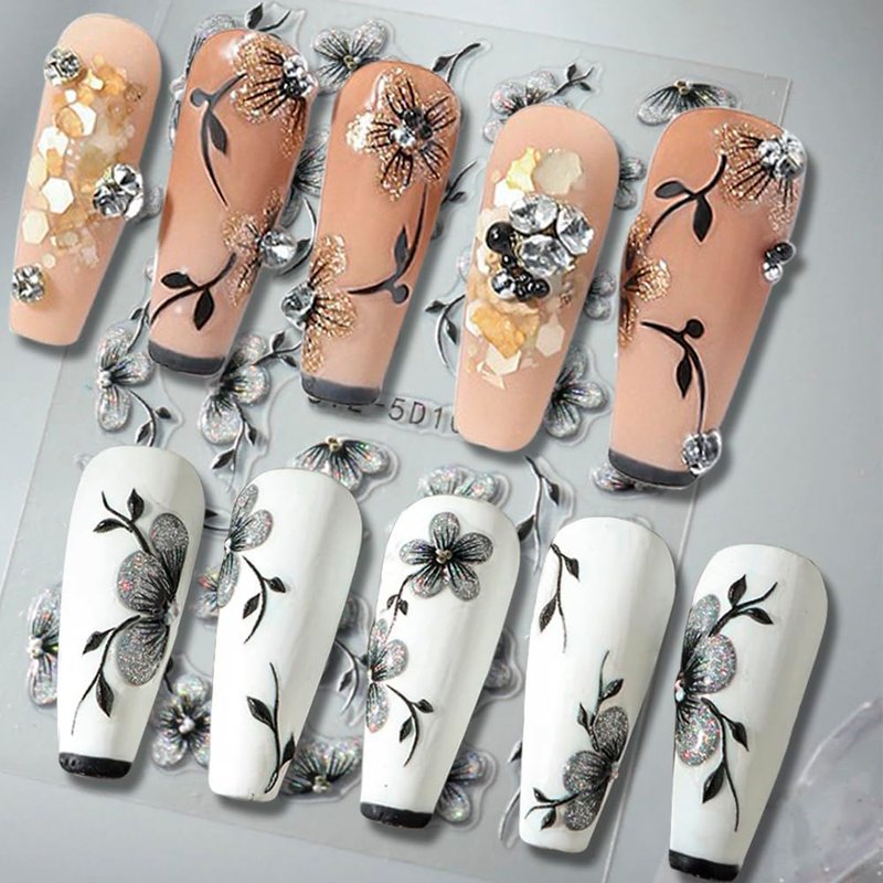 - Glitter Flower Nail Art Stickers 5D Black Silver Flower Nail Stickers 3D Black Gold Flower Stickers for Nails Floral Nail Decals For Nail Art Supplies Jelly Blossom Sticker Nails Petals Nail Decor