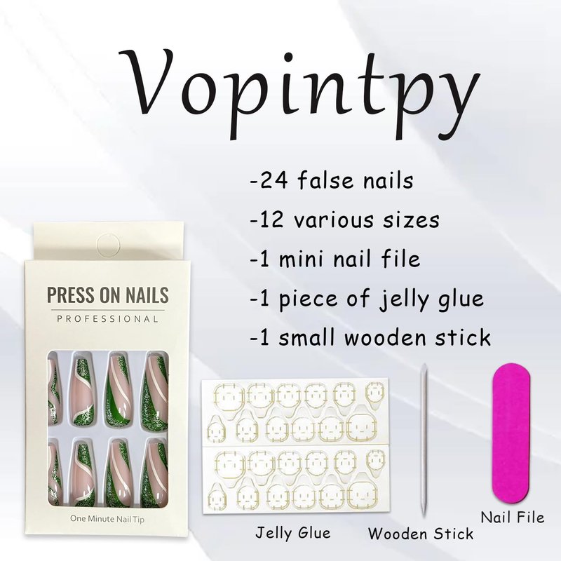 24 Pcs Glitter Green Irregular Design Press on Nails Extra Long Coffin Shape Fake Nails Set for Women Manicure Decorations
