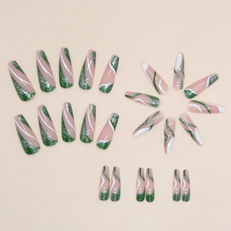 Glitter Green Irregular Pattern Press on Nails Extra Long Ballerina Fake Nails White Lines Coffin Nails Glossy Full Cover Artificial False Nails Design Reusable Stick on Nails Glue on Nails for Women
