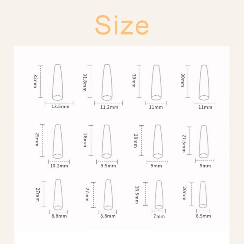 - 【Package & DIY Nails】You'll get 24 false nails in 12 sizes. 1 mini nail file, 1 small wooden stick, 1 piece of adhesive tab glue. You can safely choose a fake nail that fits your finger size and DIY your desired nail shape.