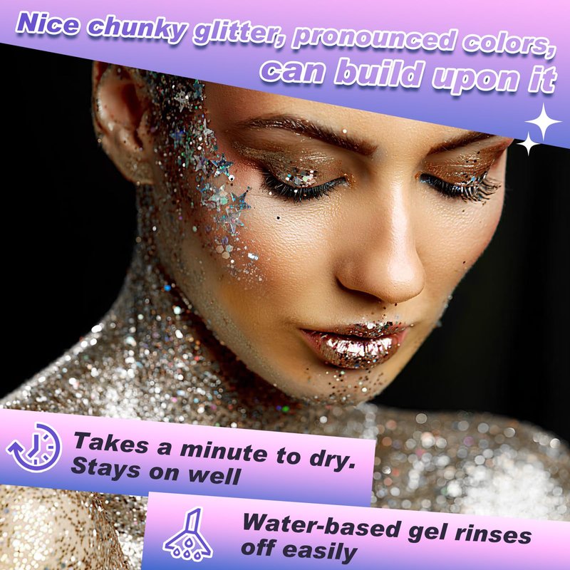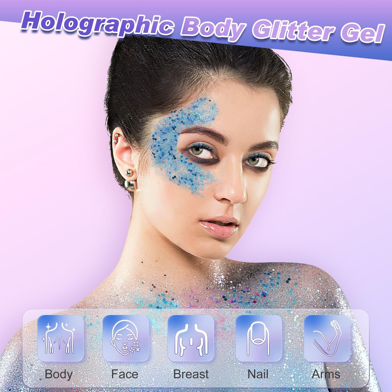 - ღ Beautiful and Sparkly Body and Hair Glitter! ღ They are holographic looking; with beautiful stars and small and large glitter clusters. The gel is very easy to spread around on the skin, and a little goes a long way. Good for concerts, girls night out, bachelorette parties, etc.