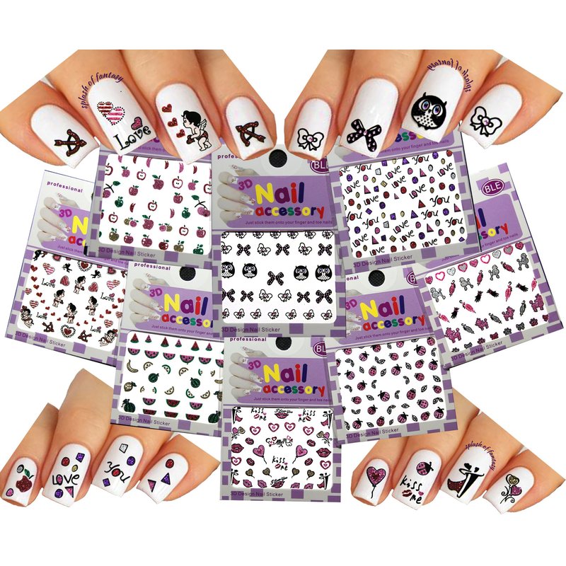 Glitter Nail Art 3D Stickers Decals Fun & Colorful Bows, Owl, Love, Poodle, Cupid, Apple, Watermelon, etc. Pack of 8 Mixed Designs