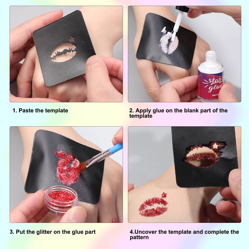 - ⭐The temporary flash glitter tattoo is easy enough for children to play with. Stick tattoo stencil and apply glue, brush on the glitter after the glue becomes transparent, then tear off stencil