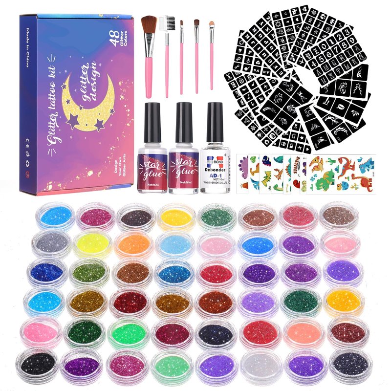 - ⭐Glitter tattoo kit for kids includes 48 colors of flash glitter, 318pcs stencils, 2 glues, 1Tattoo Remover,5 brushes and 10 Sheets Tattoo Stickers. The Temporary Glitter Tattoos set helps girls, boys shine all over the party with the unique sparkling body art
