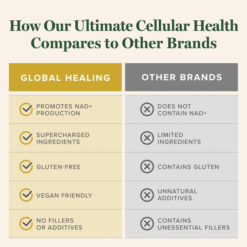 Unlock the secret to graceful aging with Global Healing Ultimate Cellular Health - a powerful NAD supplement designed for both women and men, promoting cellular repair and DNA telomere support. With our 60 capsules, perfect for those seeking an anti-aging supplement that supports NAD+ levels and overall wellness, including the innovative NAD shield for added protection, making it your go-to choice for optimal health and longevity.
