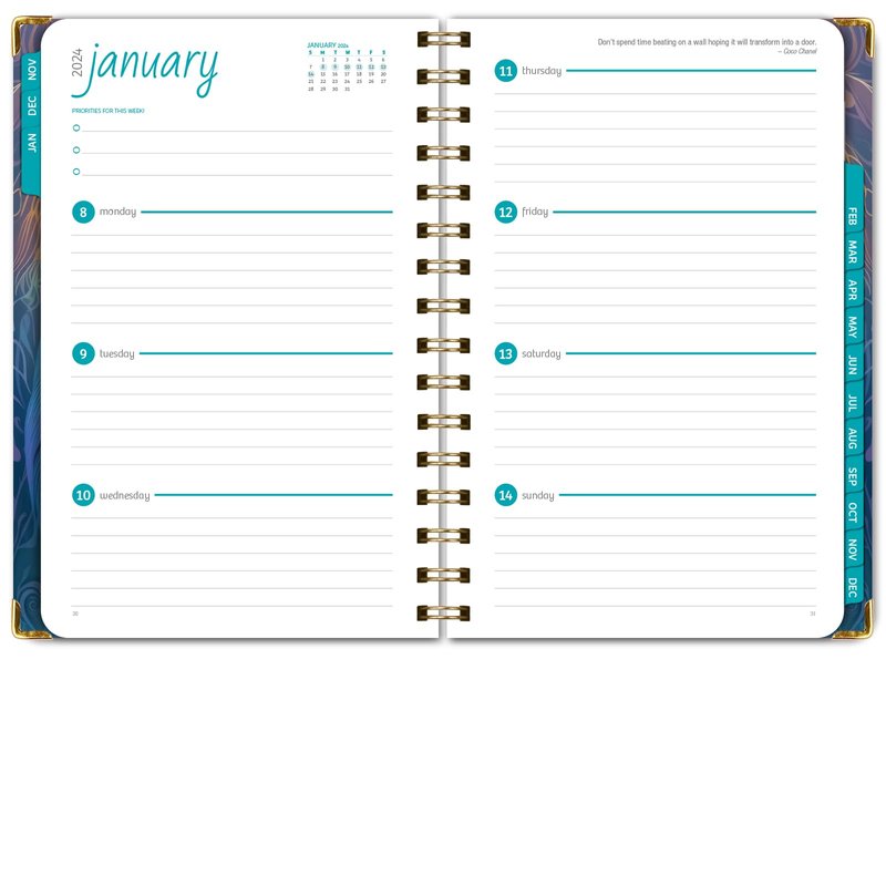 Global Printed Products HARDCOVER 2024 Planner: (November 2023 Through December 2024) 5.5"x8" Daily Weekly Monthly Planner Yearly Agenda Bookmark, Pocket Folder & Sticky Note Set (Pastel Peacock)