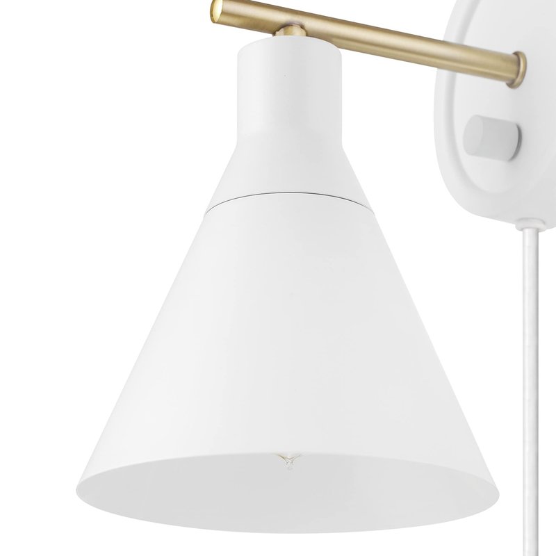 Globe Electric 65542 1-Light Dimmable Plug-in or Hardwire Wall Sconce, Matte White, Brass Accent, Stepless Dimming Rotary Switch on Canopy, White Fabric Cord, Wall Lighting, Bulb Not Included
