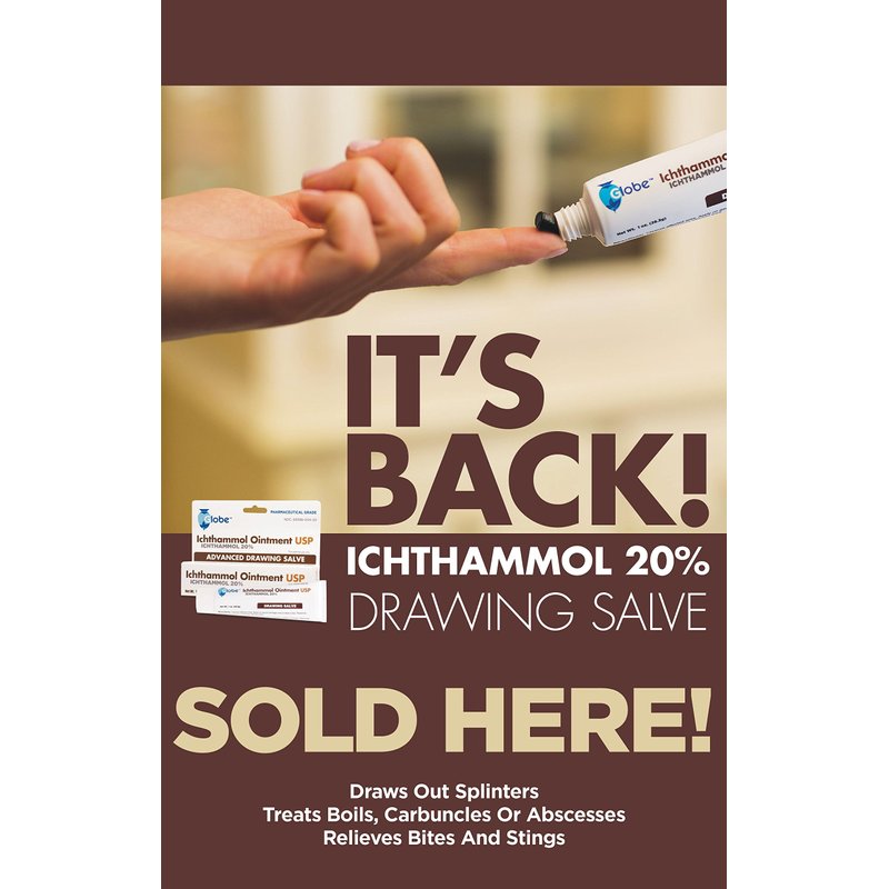 Globe Brand Pharmaceutical Grade Ichthammol Ointment 20% Contains a U.S. NDC Number. Advanced Drawing Salve Pharmacist and Doctor Recommended for: Suggested Uses: Treating plant irritations, such as nettles or poison ivy, Treating insect bites and stings from mosquitoes, spider, and bees, Removing splinters and slivers, Treating minor skin infections such as ingrown toenail, Soothing skin relief, Apply to minor skin irritations. Active Ingredient: Ichthammol USP