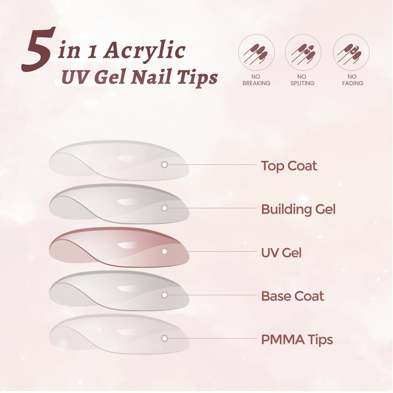 - 【SUPER TIME & MONEY SAVING,NO NEED TOP COAT】 These 5 in 1 Acrylic X UV Gel Nail Tips coffin nail tips apply with pre-applied tip base coat , uv gel polish, building gel and top coat cover. Even beginners can easy and quickly to create salon-like nail extension within 5 mins or less! Saving lots of time and money both at home and salon.
