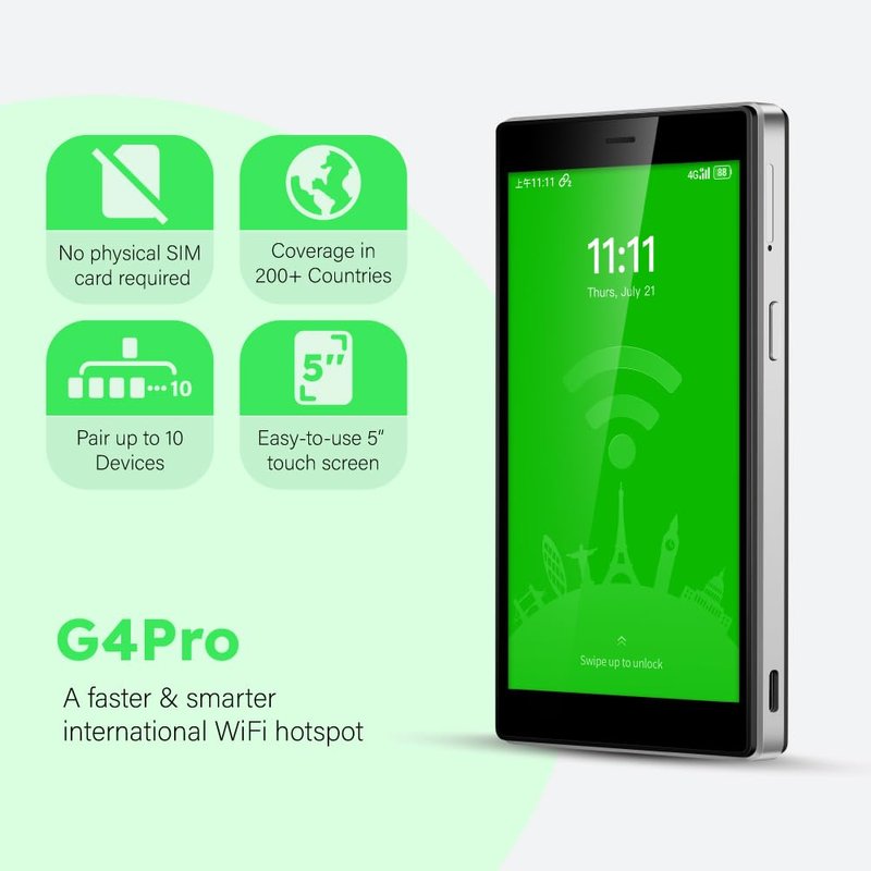 - 【No-Contract, SIM-Free, Multiple Data Plans】G4 Pro Mobile Hotspot Device does not need a SIM card to work due to the Cloud SIM Tech. Our services support NO CONTRACT or PAY AS YOU GO and offers thousands of flexible data packages which covers over 200 countries in the world for you to choose from daily, monthly, or GB packages, allowing you hassle-free access to the internet without any bindings, making it a true portable WiFi solution. But that's not all, it also supports a SIM card slot for you to use the data from your own card.
