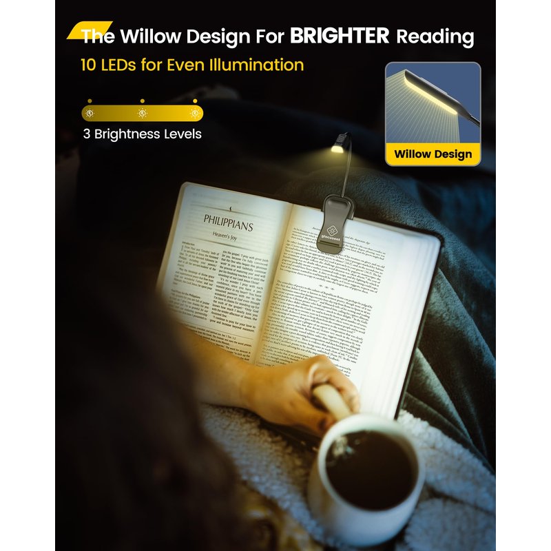 - [The Willow Design for BRIGHTER Reading] The Glocusent Willow Book Light is specially designed for bright & even illumination with 10 scientifically placed LEDs. The unique long & narrow willow leaf design ensures a more concentrated light coverage for a larger area. Plus, the 3 brightness levels can cater to all your needs, whether you prefer a bright beam or a soft glow to avoid disturbing your partner—perfect marriage with your favorite book.