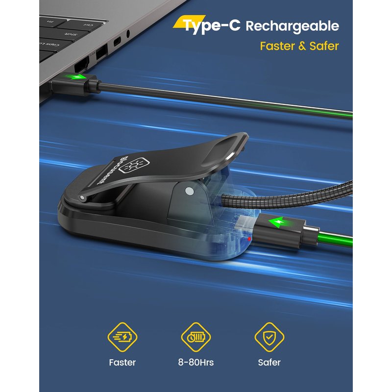- [USB-C Rechargeable, Safer & Faster] Unlike other Micro-USB rechargeable book lights, our book reading light has a USB-C charging port, which is easier to plug in as the USB-C is reversible. The USB-C cord can carry significantly more power, making it safer and faster. The Glocusent book light has a certified safety sheet (MSDS) to guarantee its safety. It reassures an 80hr runtime with one charge on the dimmest—an amazingly advanced rechargeable reading light for all readers.