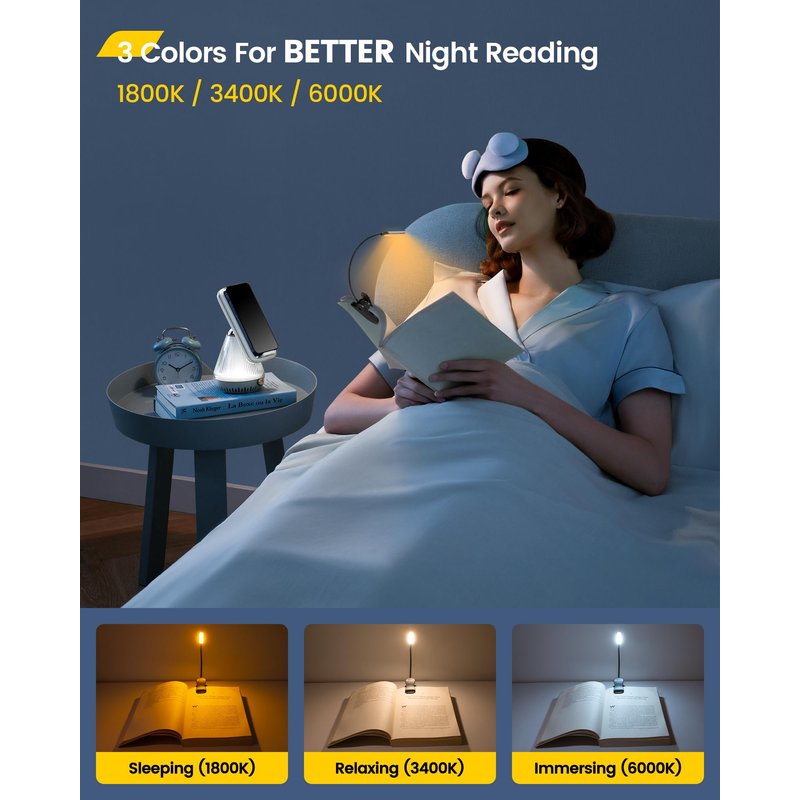 - [3 Colors for BETTER Night Reading] The 3 color temperatures allow you to set the perfect light for blissful night readings. The 1800k amber light with 99% blue light filtered promotes melatonin production while reading, so you can drift off into a peaceful & restful sleep. The 3400k reading light reduces glares and offers a cozy and enjoyable reading with no eye strain. The unique head cap emits a softer 6000k for a more immersive night reading—a must-own book light for joyful reading in bed.