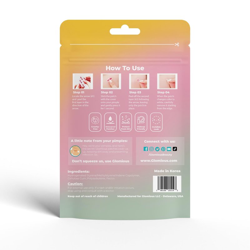 Introducing Glomious Acne Patches – your ultimate solution for clearer, healthier skin. Made in Korea with 100% hydrocolloid, these patches are designed for maximum protection of your pimple away from dirt. What sets us apart? Our patches offer a seamless, invisible look while delivering top-notch effectiveness. Plus, with our unique 2-step application process, you can say goodbye to touching the actual patch – no more fussing with tweezers or fingers. Thin, transparent, and flexible, our patches blend effortlessly into your skin. Perfect for all skin types, including sensitive skin, these patches are safe for use on your face, neck, chest, and back. They're easy to apply and remove, so you can enjoy the skin you deserve And the best part? They're makeup-friendly and cruelty-free, so you can feel good about your skincare choices. Upgrade your skincare routine with Glomious Acne Patches and say hello to clearer, smoother skin today.