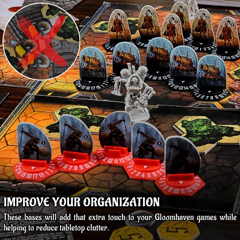 - IMPROVE YOUR ORGANIZATION - These bases will add that extra touch to your Gloomhaven games while helping to reduce tabletop clutter. They will help you manage your campaigns more quickly by keeping the information visible right where the enemy sits in the gameplay area.