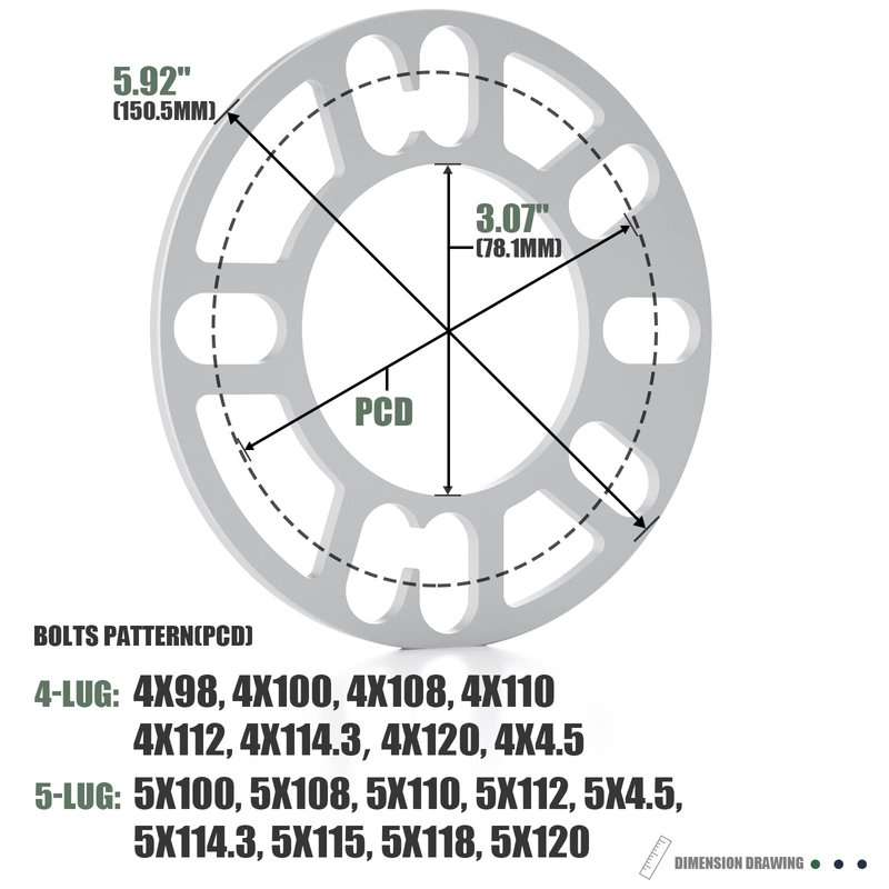 - 【FITS】4 lug or 5 lug wheels with PCD 98-120mm (the span on bolts), 4-Lug: 4x98, 4x100, 4x108, 4x110, 4x112, 4x114.3, 4x120, 4x4.5 / 5-Lug: 5x100, 5x108, 5x110, 5x112, 5x114.3, 5x115, 5x118, 5x120, 5x4.5