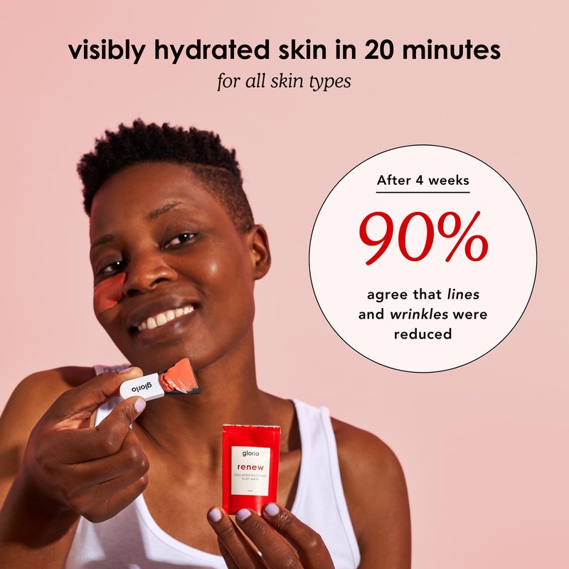 "Discover the ultimate in self care with Glorio's Renew Collagen-Boosting Clay Mask. This luxurious face mask combines the power of Red Clay from Brazil, Retinol, Hyaluronic Acid, Niacinamide, and Peptides to create a skincare experience like no other. Perfect for women and men who are beauty conscious, this clay mask is designed to reduce fine lines and wrinkles, improve skin elasticity, and balance skin tone. Whether you're looking for self care items or unique gift ideas, this mask is a must-have addition to any skincare routine. Each set includes 8 single-use pods, ensuring freshness and potency for up to 8 weeks of treatments. The convenient pods are paired with a silicone brush, making application a breeze. Packaged in a beautiful gift box, this set is a perfect pampering gift for women, teens, and anyone who loves facial care. Our Renew Collagen-Boosting Clay Mask is made in the USA and is plastic-free, reflecting our commitment to both quality and the environment. This collagen mask is suitable for all skin types, offering a spa-like experience in the comfort of your own home. The unique blend of aztec clay and red clay not only detoxifies but also hydrates, leaving your skin glowing and rejuvenated. Looking for gifts for teens or bachelorette party gifts? This skincare set makes an excellent choice. The powerful combination of ingredients in our clay mask provides a comprehensive facial skin care treatment, addressing concerns like fine lines, wrinkles, and uneven skin tone. It's not just a mask; it's a beauty secret that promises to enhance your skincare routine. Our Renew Collagen-Boosting Clay Mask is more than just a beauty product; it's a complete facial kit for women and men who prioritize skincare. With benefits that go beyond mere moisturization, this mask helps in reducing the signs of aging, making it an essential part of any glow up essentials for women.