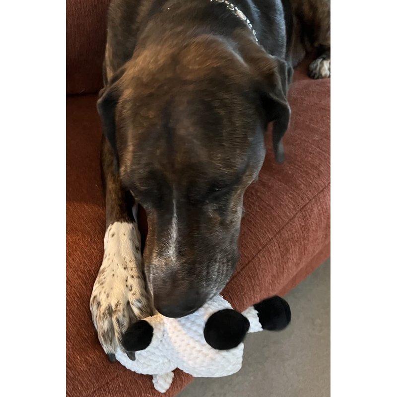 - Crinkle material in ears and squeaker in the belly for aural stimulation while chewing or tugging
