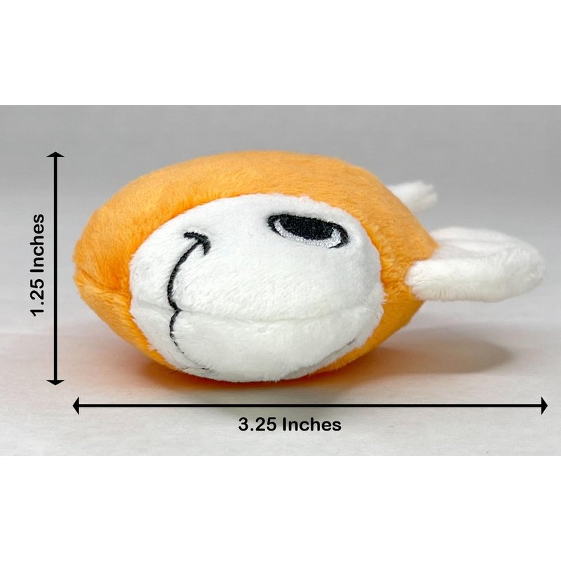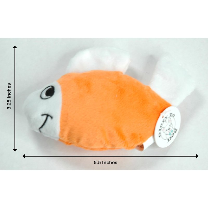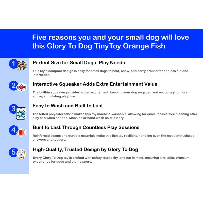 - The Glory To Dog TinyToy Goldfish is a delightful, brightly colored plush toy designed specifically for small dogs. Its compact size, measuring 5.5 inches by 3 inches, makes it ideal for gentle chewing and playful chasing. Featuring a soft, plush outer layer, this toy is perfect for smaller pups who love to tug and toss. The adorable design, complete with a white tail and fins, ensures hours of fun and engagement, while the vibrant colors keep your dog’s interest high during playtime.