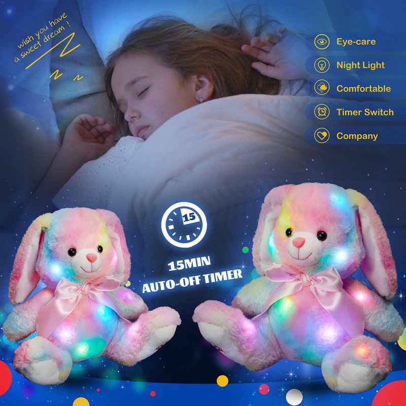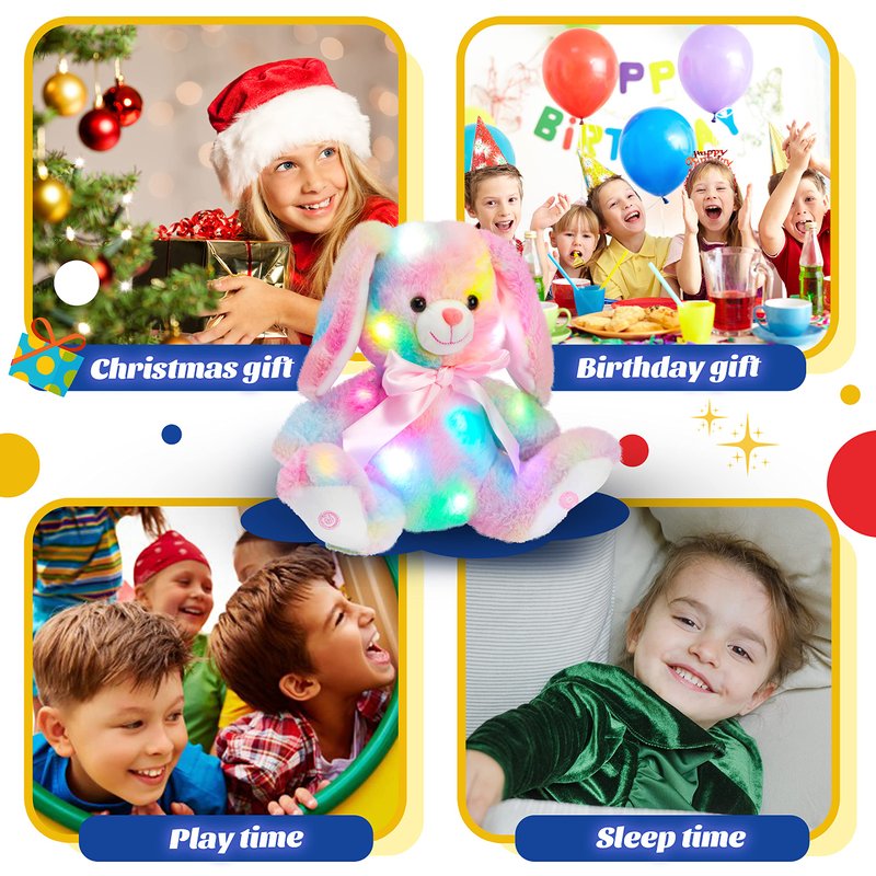 - GOOD GIFT SELECTION: This rabbit doll is very cute and soft to the touch. It can shine in the dark and accompany children who are afraid of the dark at night. This is very suitable as a birthday gift or holiday gift for friends or children. Those who receive gifts will be very pleasantly surprised.