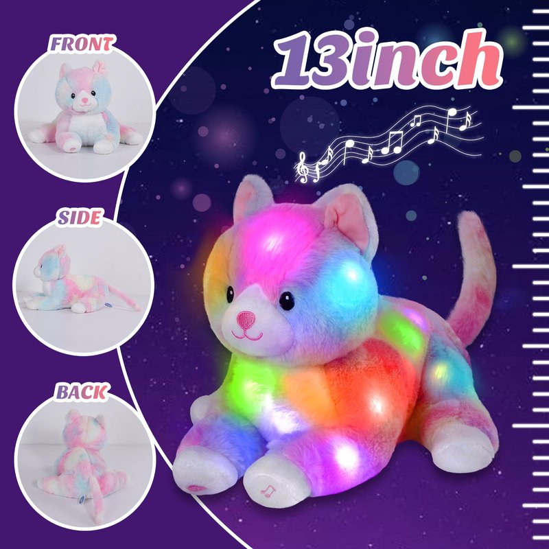 - Glow in the Dark: Our rainbow kitty will glow, when a child is afraid of falling asleep in the dark, the LED doll cat will accompany her and emit colorful lights to light up the night. Find the light switch on the bottom of the cat doll's feet, and you can emit beautiful lights to attract children's attention
