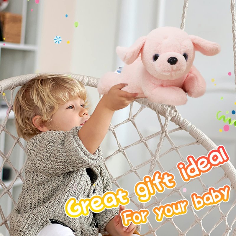 - ADORABLE PUPPY-The pink dog plush is about 15 inches long, and 7.5 inches tall, which is a huggable size for embracing and hugging. It is lying on its stomach with its two big ears drooping, besides, it two watery eyes add more sweetness for the stuffed dog. All the great design make it a cuddly dog toy.