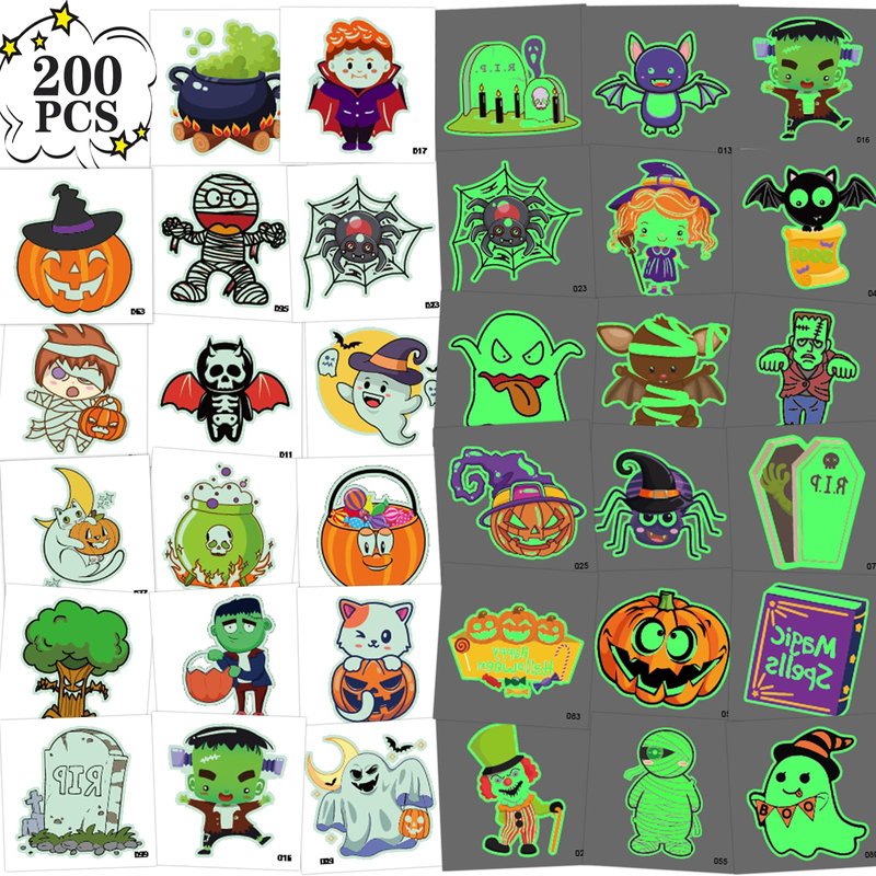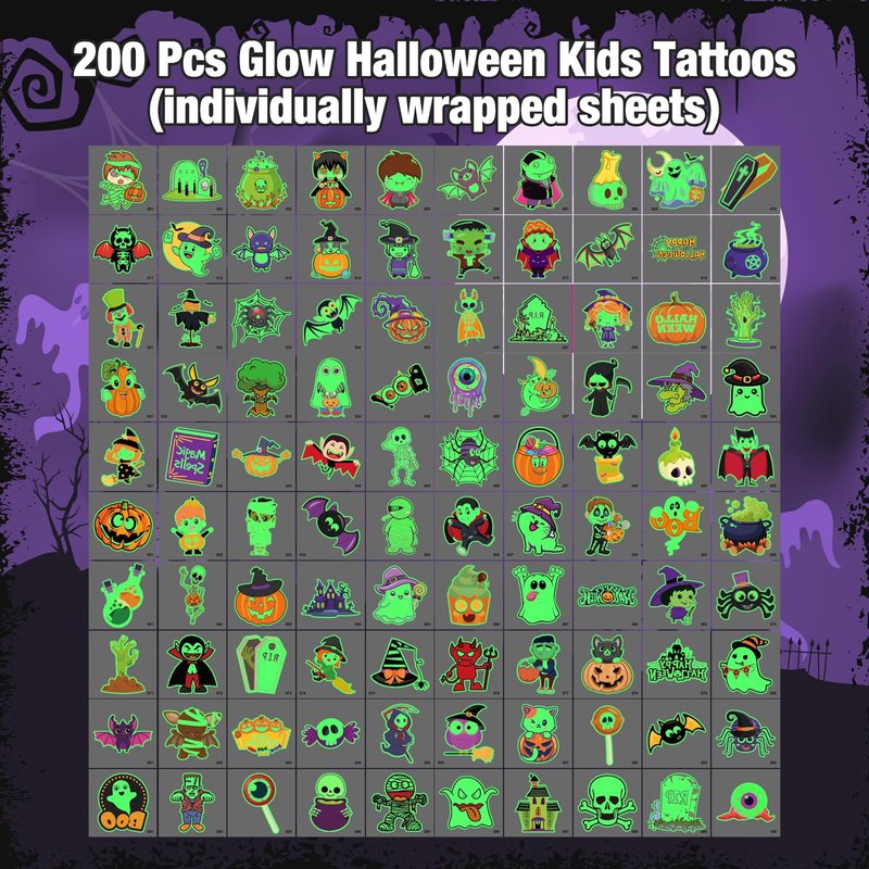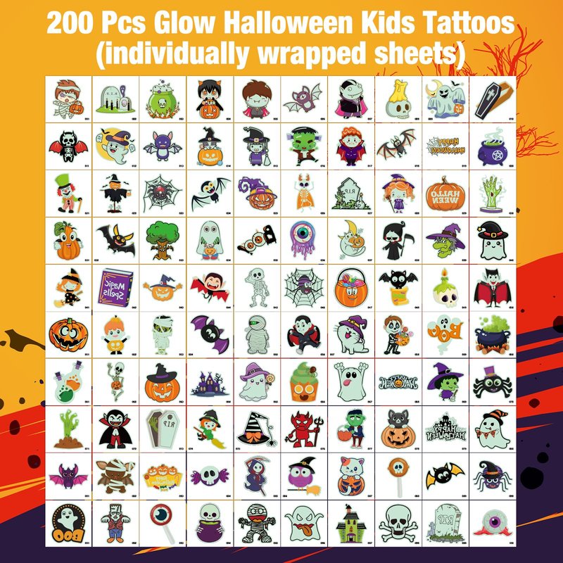 - Glow and Lasting: The package contains 200 glow Halloween temporary tattoos. It is also a good choice to distribute these glow tattoos as Halloween gifts to those kids who are asking for candy! Our temporary tattoos have been rigorously tested, and the fake tattoos can last a whole day or more.