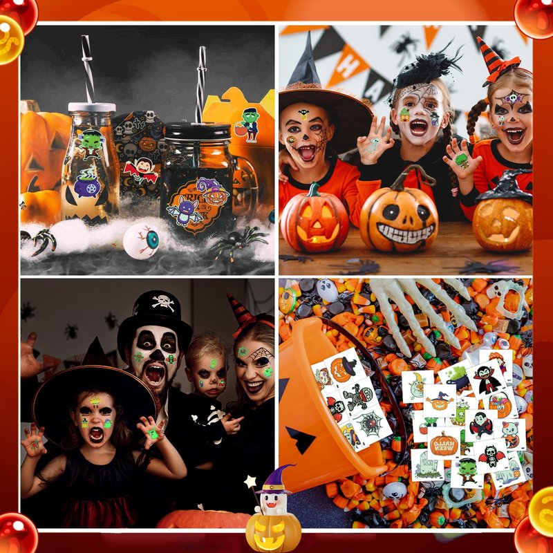 - Glow-in-the-dark Tattoos for Kids' Party Decoration: Super cute glow in the dark tattoos. Even at crowded parties, these glow tattoos will make you stand out from the crowd! Cute elements of our fake tattoos include pumpkins, ghosts, spider webs, zombies, skeletons, candies, witches, and other patterns kids love!