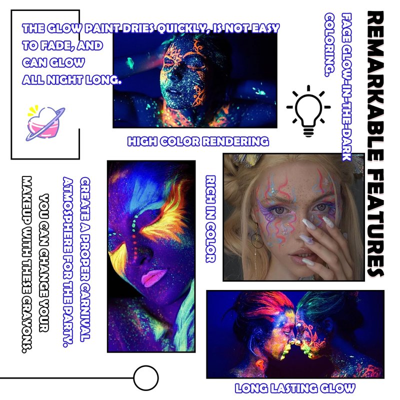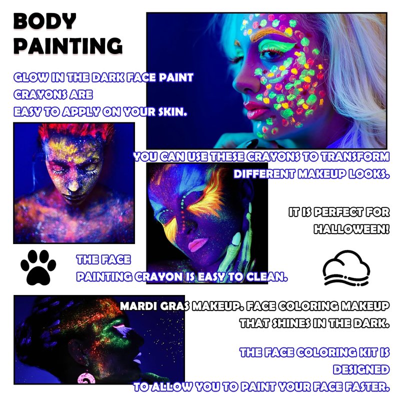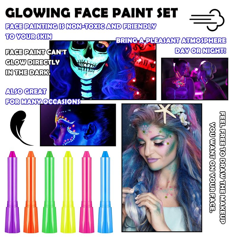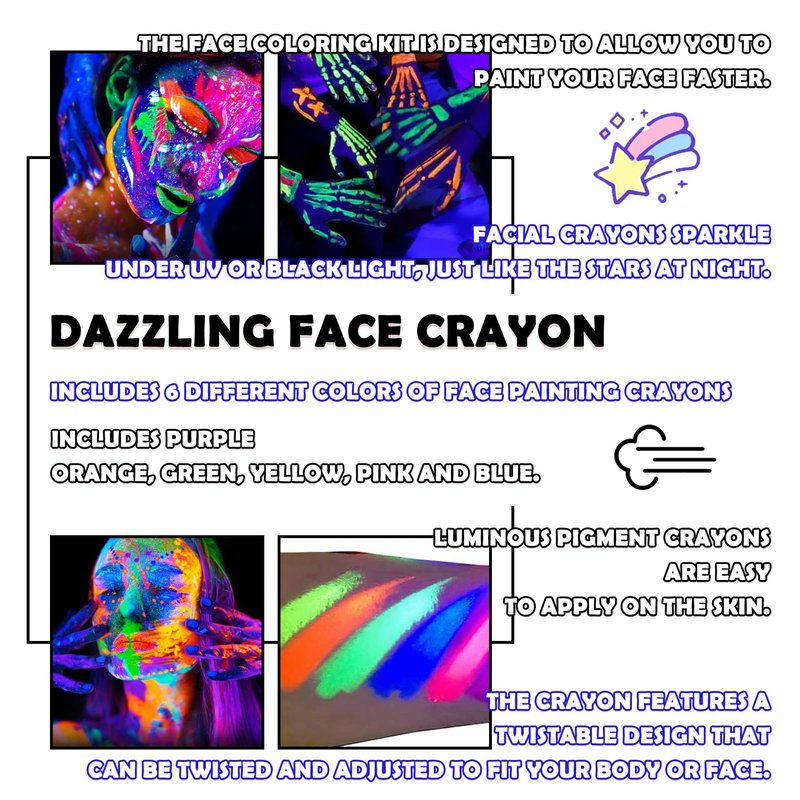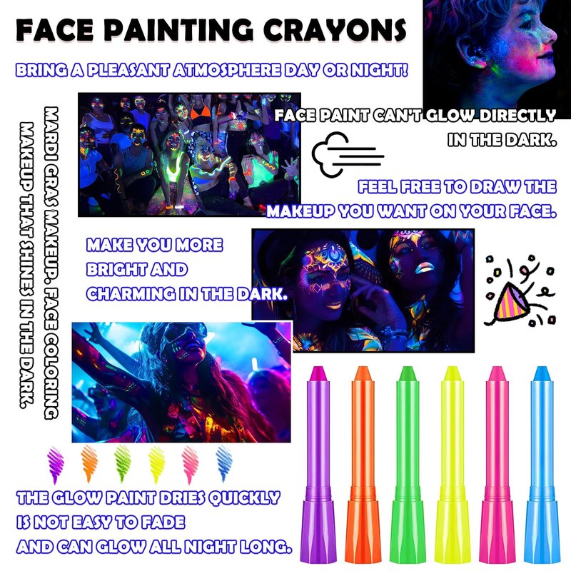 Glow in The Dark Face Body Paint Crayons Kit,Neon Fluorescent Luminous Face Crayons for Kid,Washable Painting Crayons for Mardi Gras Halloween Masquerades Makeup