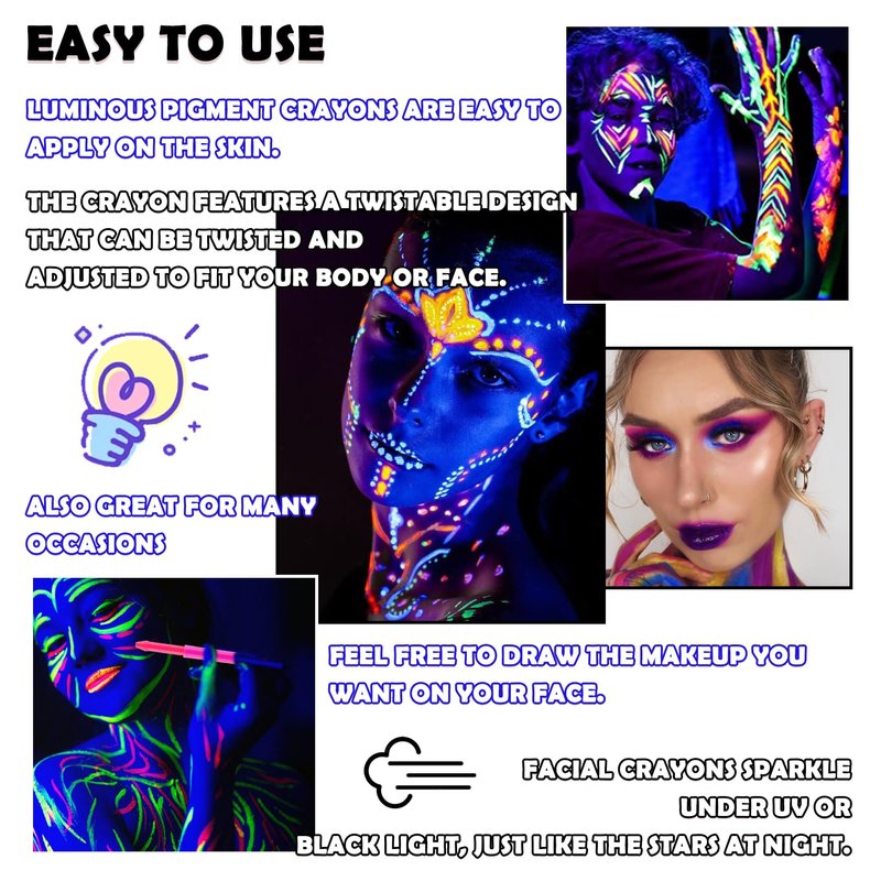 - ✨【Dazzling Effect】Painting crayons can be used not only in regular light,but also in the dark with a dazzling effect.Whether you are attending a party,stage performance or a night out,you will be able to show your personality and charm to the fullest.
