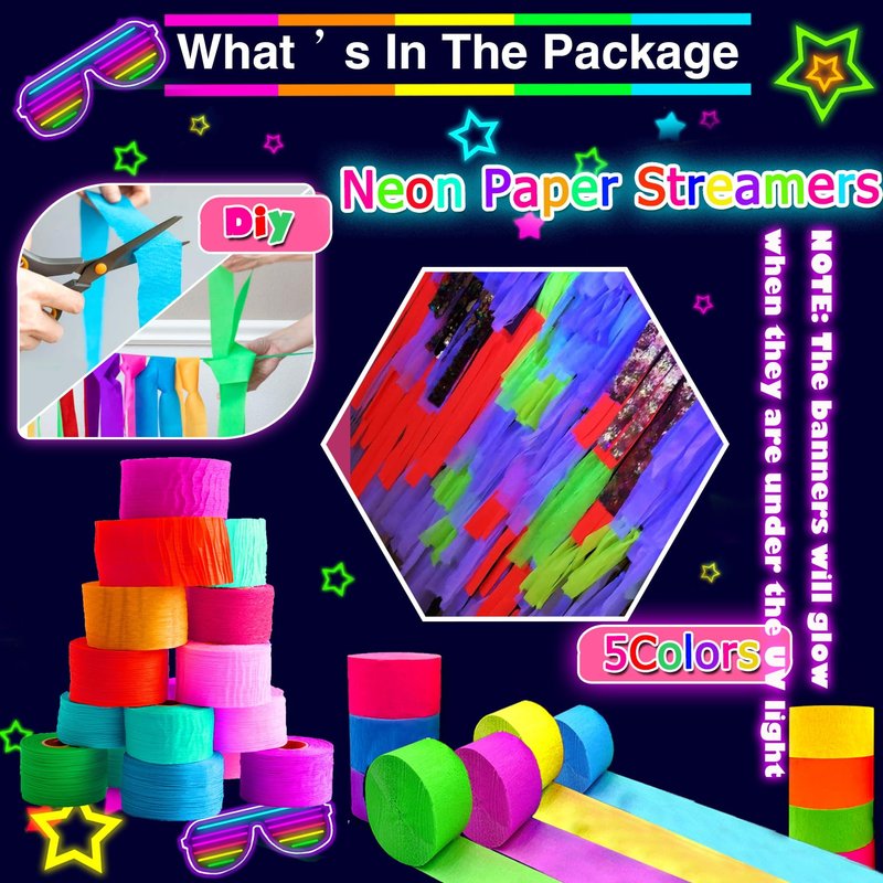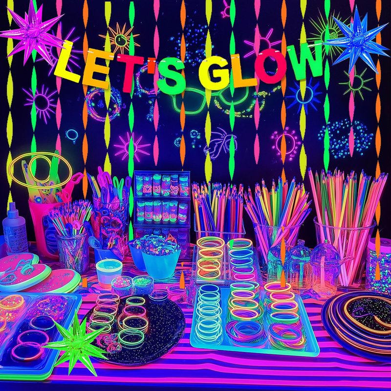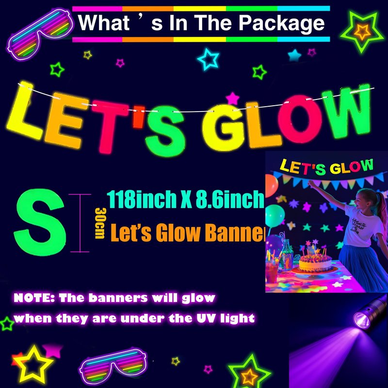 - Glow-Tastic Party Decor: Glow in the dark and neon party decorations are the perfect way to create a vibrant, energetic atmosphere for any celebration.These eye-catching decorations include a 'Let's Glow' banner, 140pcs glow-in-the-dark balloons, 5pcs star foil balloons and 5pcs neon paper streamers that will transform any space into a dazzling wonderland