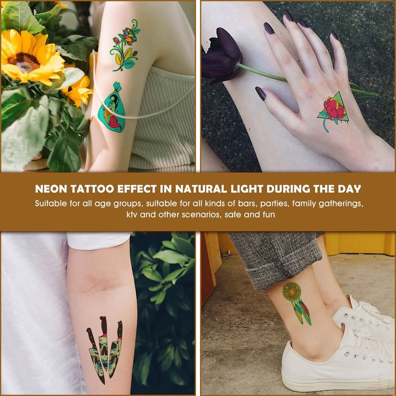 - 🌹【Applicable Occasions】- These UV luminous neon fake tattoos with multi designs are perfect for almost any occasion such as beach, Gym, Halloween, Christmas, party, club, carnival, traveling, festivals, vacations, concerts, bachelorette parties, bars and anywhere really!