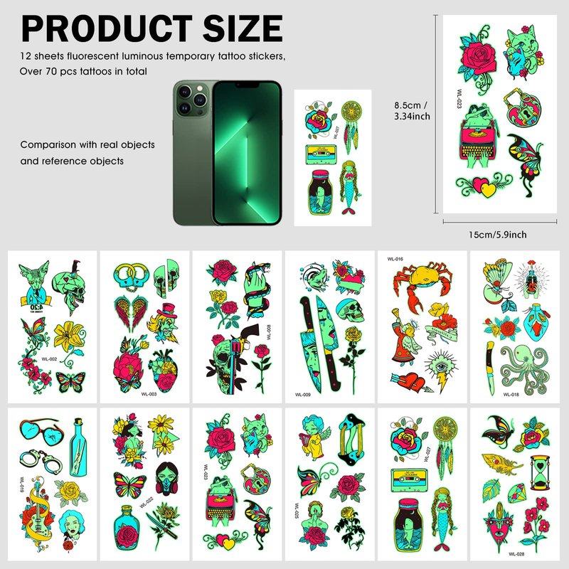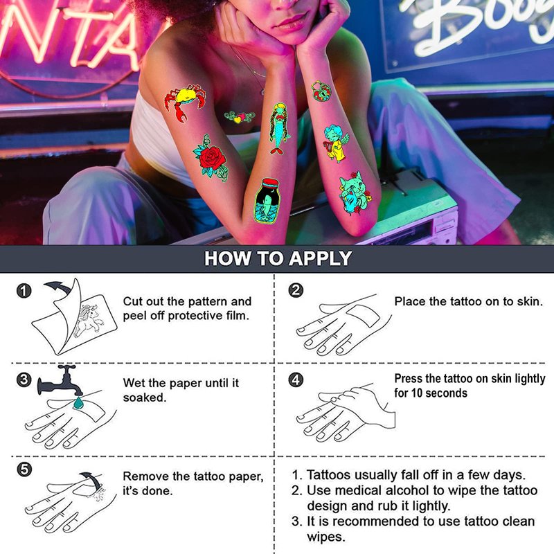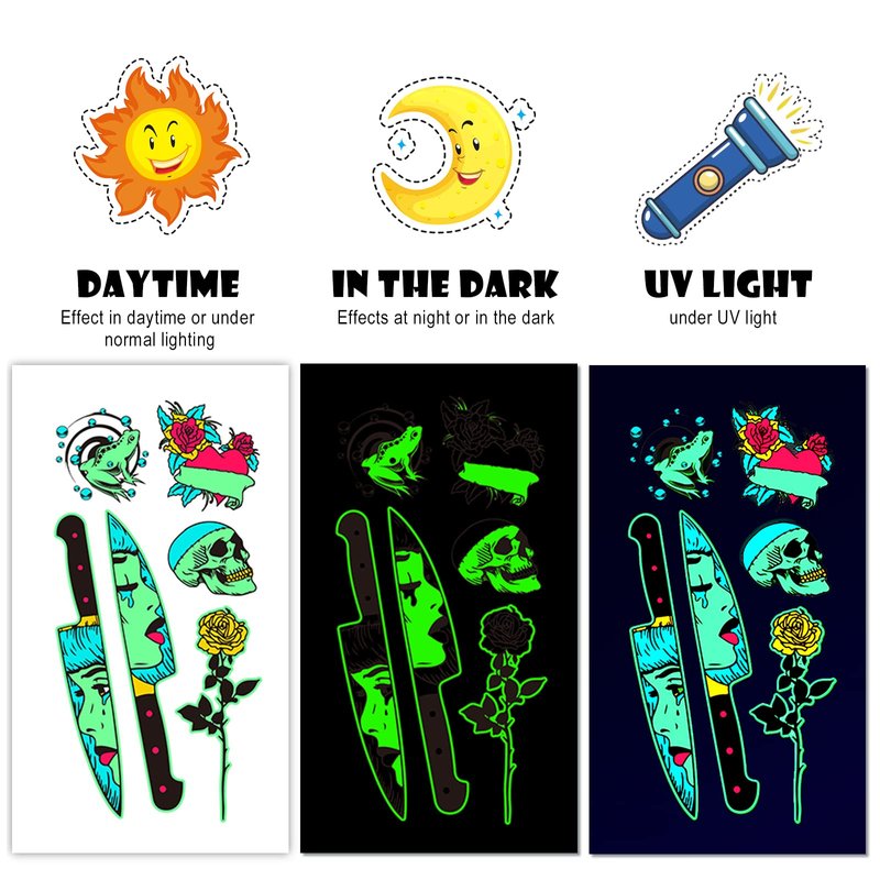 - ✨【Luminous + Fluorescent Double-Effects】- These temporary tattoos are luminous and fluorescent double-effect tattoo stickers. They could glow in the dark and also shinning brightly under UV light, offering magical and a cooler environment in the dark.