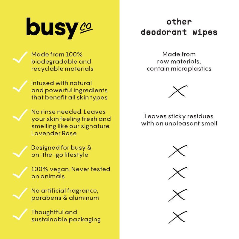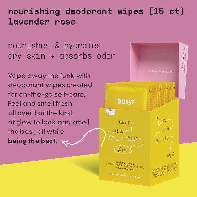 - More Time for You, Less Stress on the Earth: Busy was born because our founder was fed up with unfair beauty expectations and the lack of accessible, self-care wipes designed with you and the planet in mind. Jamie decided to create her own line of body cleansing wipes and deodorant wipes that are good for mama Earth and all of womenkind.